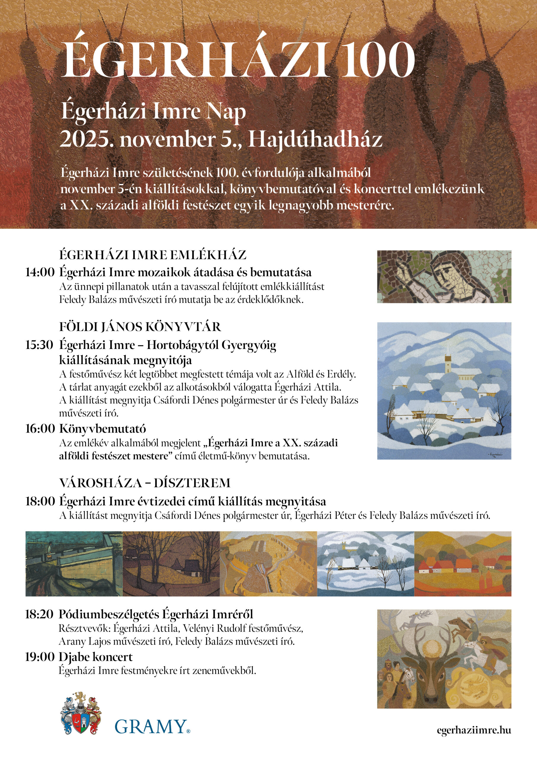Égerházi Imre festőművész, a város szülötte, ebben az évben lenne 100 éves. Ebből az alkalomból a városban az Égerházi Imre Emlékházban, a Földi János könyvtárban és a Városháza Dísztermében is kiállítások nyílnak. A városházán, az „Égerházi Imre évtizedei” kiállítás megnyitóján, a Djabe zenekar is közreműködik. A nap záróeseménye 18 órakor kezdődik.